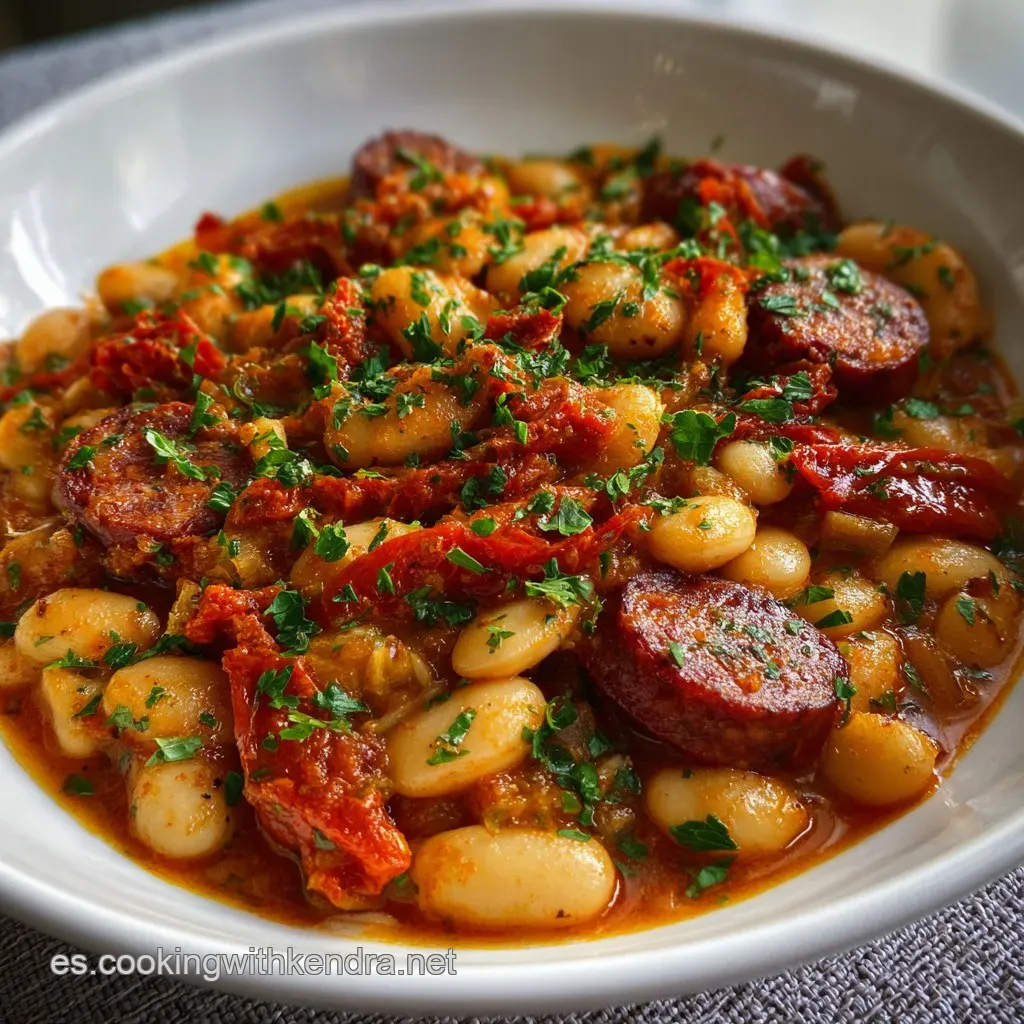 Apaga el fuego y deja que las alubias blancas con chorizo reposen al menos 15 minutos con la tapa abierta. Sentirás cómo los sabores se asientan y la textura se vuelve aún más aterciopelada antes de servir.